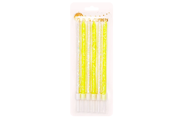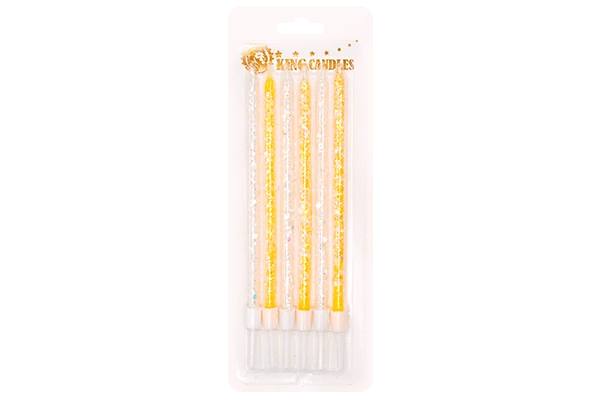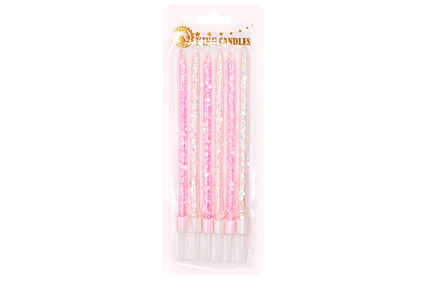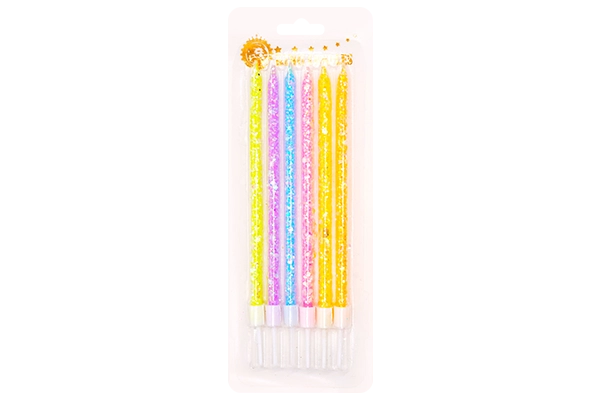 Give every celebration a luxe, modern shimmer with pastel salt glitter pencil candles—a refined 6-pack crafted from premium paraffin and finished with fine pastel salt glitter. The slim pencil profile adds elegant height without crowding the cake surface, while the salt-glitter finish delivers a soft, crystalline sparkle that reads premium in person and on camera. Perfect for boutique bakeries, party shops, caterers, and event stylists who want showpiece results with minimal setup.