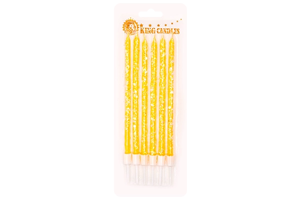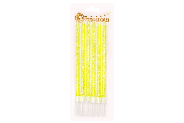 Insert candles upright into firm icing for straight alignment and minimal drip. Keep away from drafts and flammable décor; always supervise while lit. To finish cleanly, snuff the flames, allow to cool, then lift gently and wipe any residue if needed. Store packs flat, away from heat and direct sunlight to preserve color and sparkle.